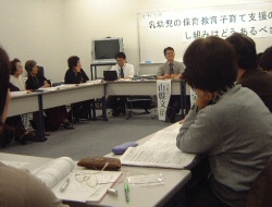 基調講演は「総合施設・次世代育成をめぐる国の施策の動向」(大阪市大教授 山縣文治氏)ほか。後半の分科会は、体が6つほしいほど迷った末、保育・教育のあり方と子育て支援を考える会へ。保育所運営費の一般財源化、加速する民営化、幼保一元化(総合施設)などについて、保育園や幼稚園関係者からそれぞれの事情と思いを聞けました。