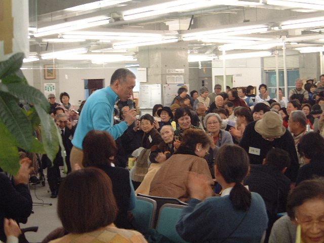 広いオープンスペースは復興住宅にお住まいの方々やボランティアでいっぱいでした。和太鼓演奏の後は、朝日放送ラジオ・パーソナリティ、妹尾和夫さんの楽しいトーク。被災した町を連日訪ね歩いて報道された妹尾さんとの再会を喜ぶ人もいて、会場はあったか~いムードでした。