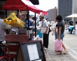 中心市街地の今むかしを見せる映像ショーはノスタルジックで、新鮮。足湯体験コーナーにはお客が並んでいたので、テラスに登場したオープンカフェで黒豆入り豆乳珈琲をいただいてきました。