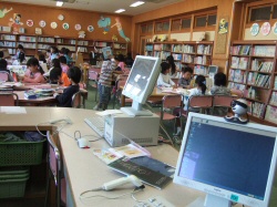 *PCで蔵書管理する学校図書館(宝塚第一小)。他校や市立図書館の蔵書も検索できる。あとは物流ネットワークのみ