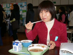 「授業ができる栄養職員を増やしたい。学校のもつノウハウをいかに地域に還元していけるかだ」と小谷校長。地場産給食や地域の特色を生かした献立が実現できたら素晴らしいですね。『西谷秋の味覚給食』(黒豆ごはん、さつま汁、鶏肉の南部揚げ、だいこんサラダ、柿、牛乳)――おいしかったぁ!