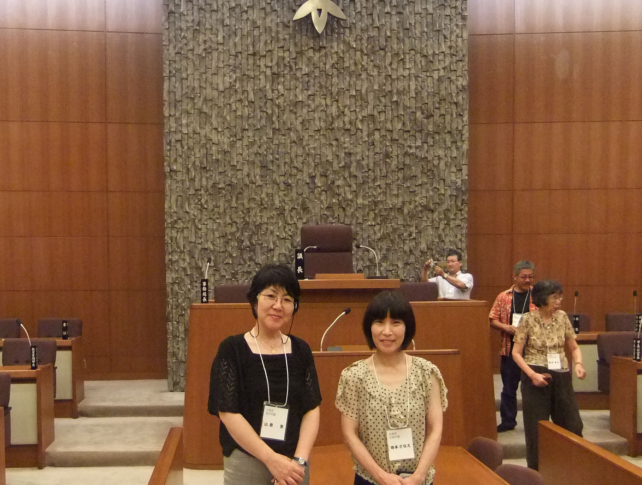 *高槻市議会の議場にて、山敷めぐみ・高石市議と。従妹です