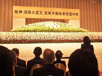 リアルタイムの追悼から帰宅後、ひと休みして、男女共同参画センター主催の「震災を体験した私たちからのメッセージ」(初代所長の東郷さんと、震災時に救援活動の中心を担った元職員・松藤さんの話です)をのぞき、11時から宝塚ホテルで開催される市の追悼式へ。