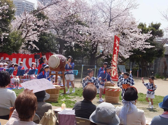 お花見日和となった週末。宝塚幼稚園で開かれた宝小コミュニティの花見会に出かけてきました。