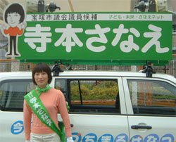 街宣カーもスタンバイ 2003年4月16日 「告示日」の20日から市内をまわる街宣車。レンタカーに看板(宝塚歌劇の元大道具さんの手づくりです)を載せ、スピーカーを取り付ける作業が完了しました。 「未来につなげるまちづくりを、今!」のステッカーもPTA仲間の手づくりです。 警察の審査(17日)をパスしたら、告示日まで白い布で覆って出番を待ちます。