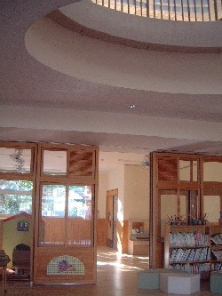 仁川幼稚園の新園舎は木をふんだんに用いたすばらしい設計。吹き抜けのあるホールと保育室には昼下がりのやさしい陽光が差し込んでいました。あちこちに飾られたトールペイントのプレートは40人ものお母さんたちによるお手製。一段とかわいらしい絵から“3歳さん”を歓迎する心が伝わってきます。