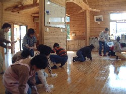 在会児の保護者とOB、当時の指導員の先生たちも集まって、大掃除をしました。サンダーをかけ、梁やプロペラの埃をはらい、床を水拭き、桐油を塗って、乾燥。子どもたちもデッキの手すりに防腐剤を塗ったり、溝をさらったり、楽しそうです。