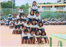 わが子とともに保育所を巣立った子どもたちが、組み体操で“踏ん張って”いたり、てっぺんにいたり。