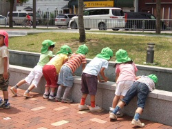 * 紫外線防止用ひたたれ付キャップ。保育所時代に提案して笑われたけど、今では夏の必需品です♪