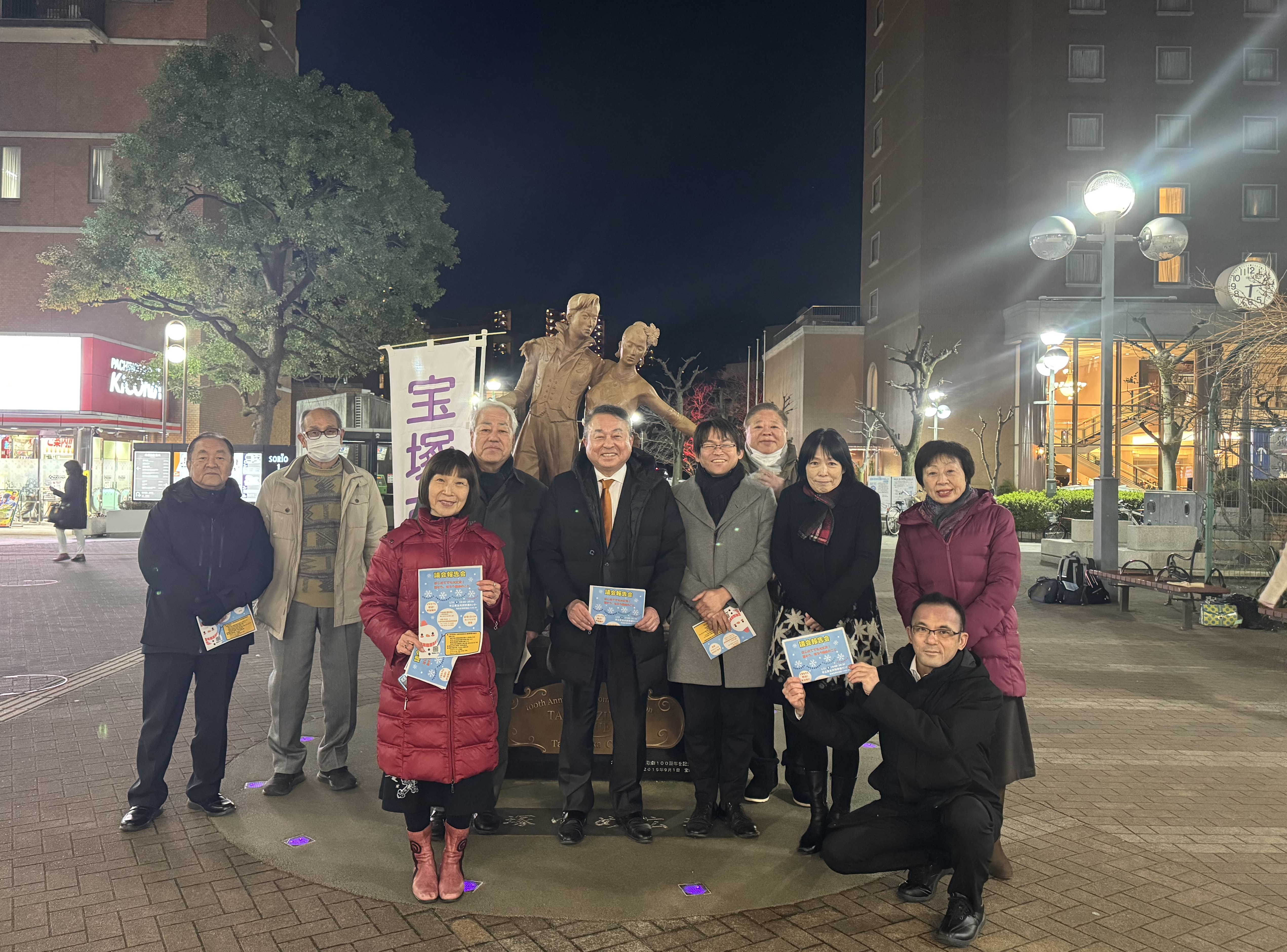 夕方、阪急宝塚駅前ゆめ広場でお知らせチラシを配りました。