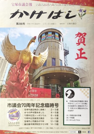 コンテンツは、①宝塚市議会検定に挑戦! ②まちの声を聞きました ③70周年記念シンポジウム ④70周年記念意見交換会 ⑤宝塚市と市議会の70年 ⑥議会基本条例から14年。お正月っぽいデザインに仕上げています。